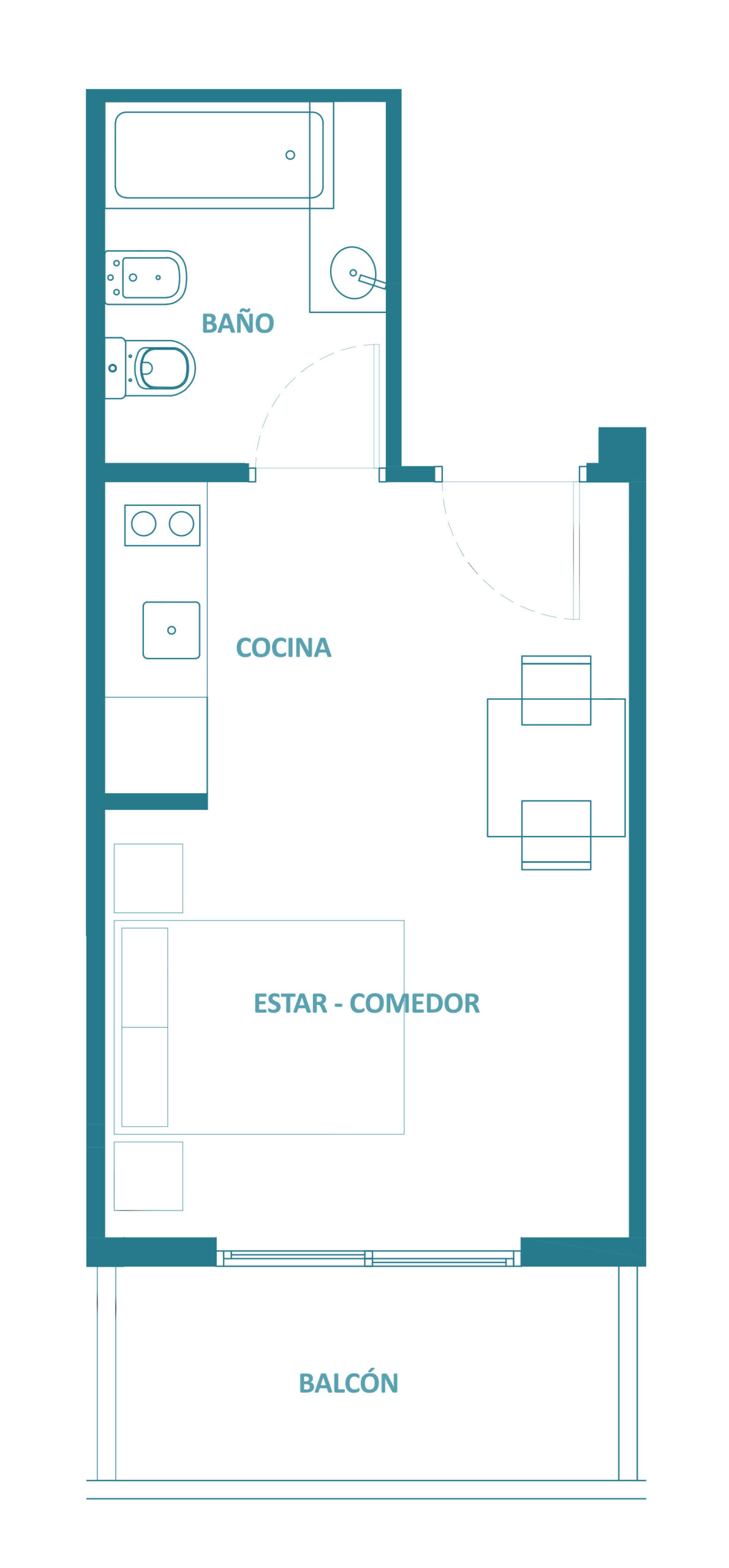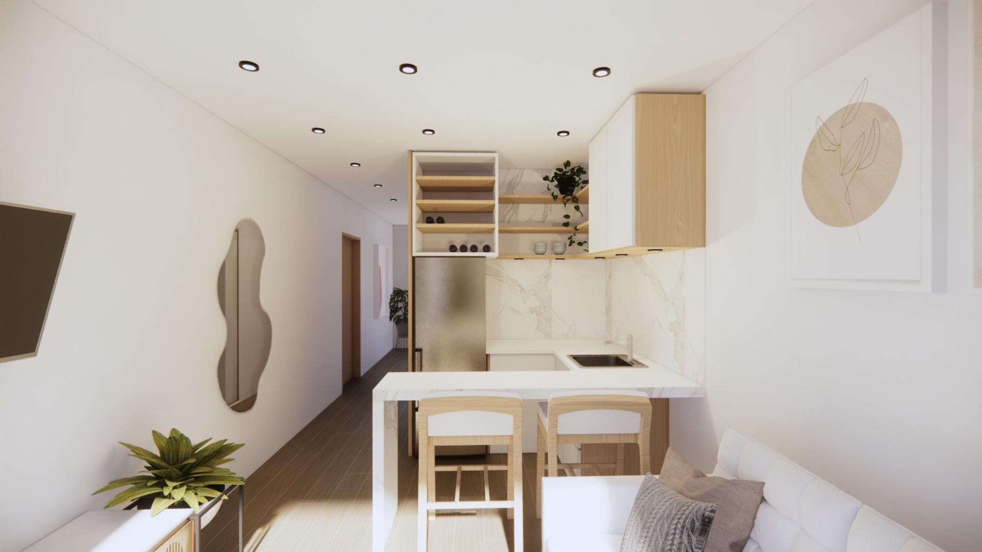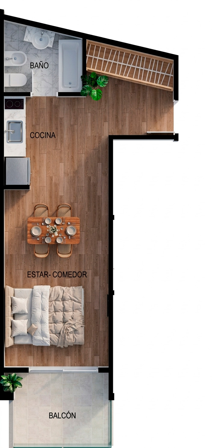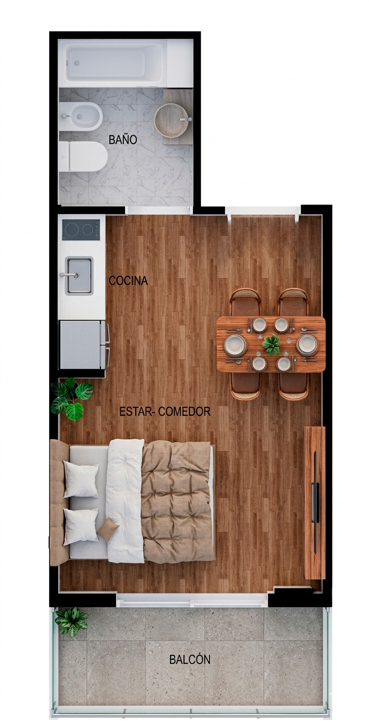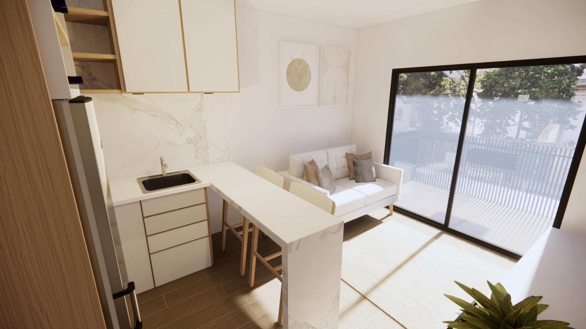 Departamento de un 1 ambiente al frente con balcón. Dispone de un espacioso estar – comedor y cocina integrada. Doble ventilación. Baño completo.