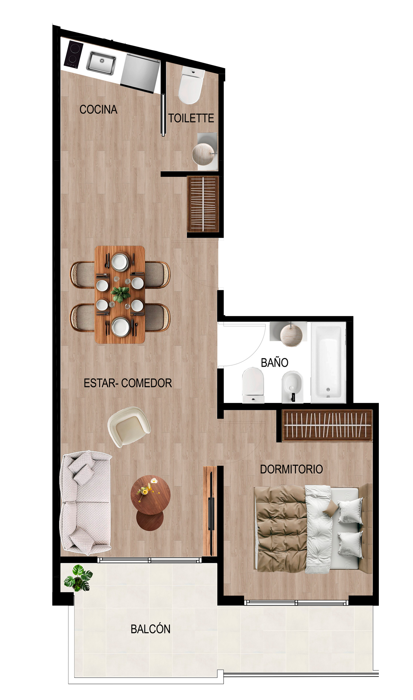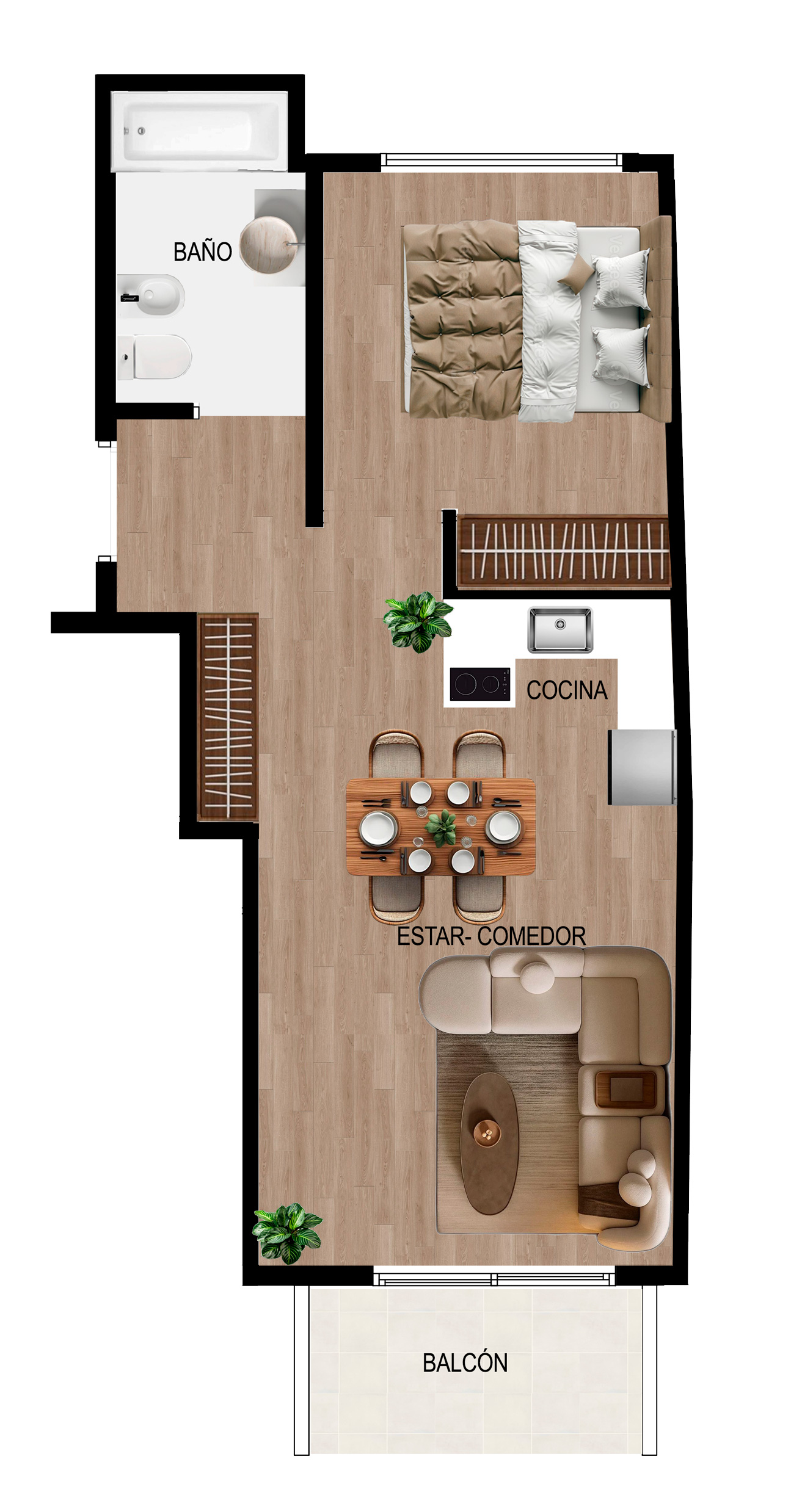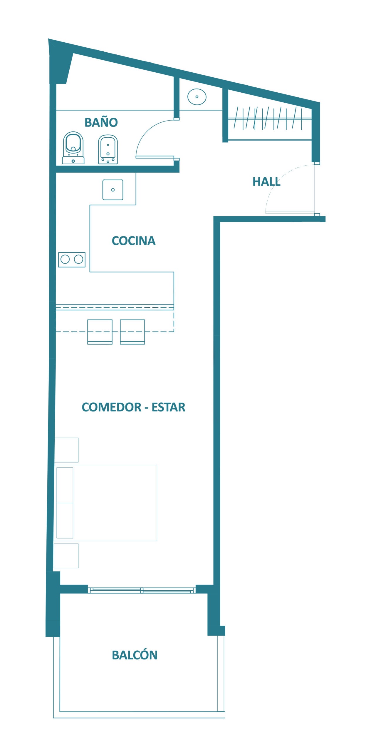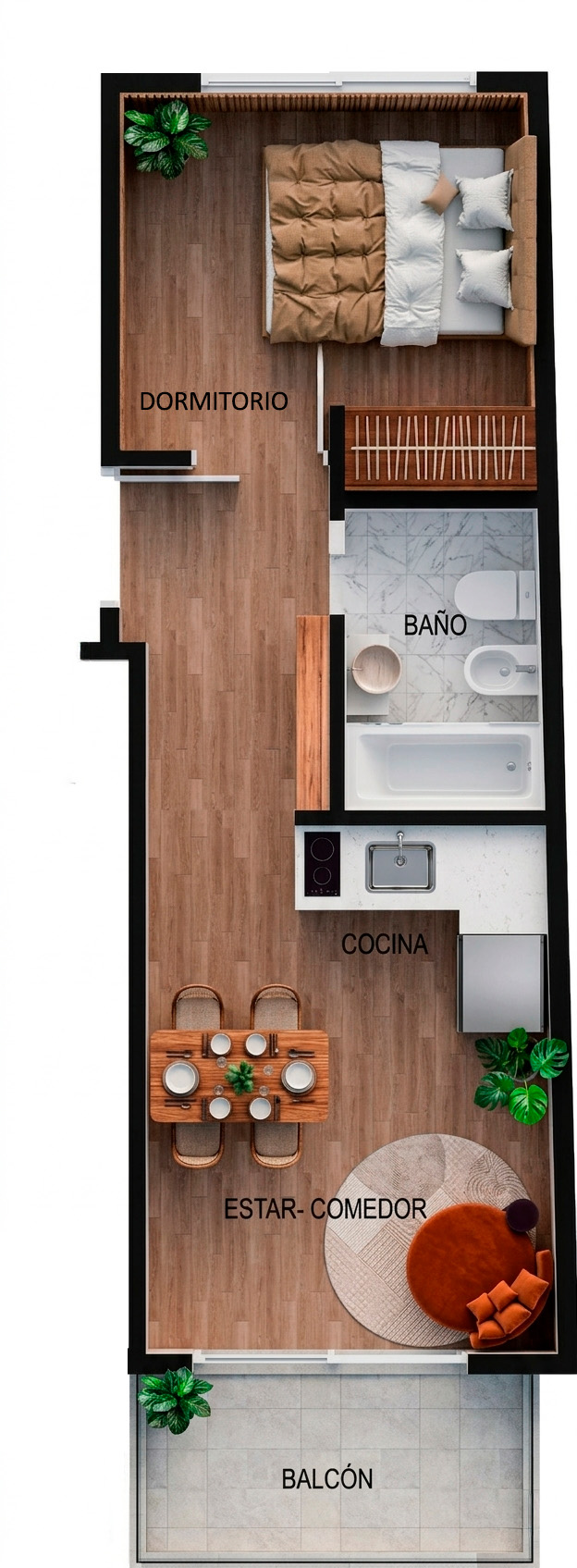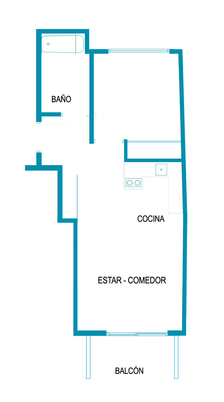 Departamento de un 1 ambiente al frente con balcón. Dispone de un espacioso estar – comedor y cocina integrada. Doble ventilación. Baño completo.